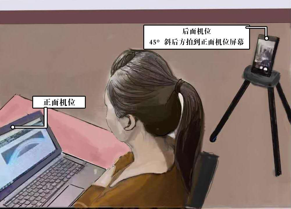 ①第一机位为面试主机位,面向考生,用于复试考官对考生的远程视频考核(建议使用带有线网络的笔记本电脑或台式机加摄像头、麦克风、音箱,也可为平板电脑)。放置面试主机位的书桌应紧贴墙面摆放。桌面上只允许摆放面试设备和报考学院要求准备的其它考试用品。复试全程应保证设备电量充足,网络连接正常。考生端两台设备均开启摄像头。考生本人正对设备摄像头,保持坐姿端正,面部、上半身在画面中要清晰可见。面试时考生本人应保持发型整洁,素颜、露耳、束发、不可佩戴帽子、墨镜、口罩、不可佩戴首饰,面试不得使用耳机。复试全程考生应保持注视摄像头,视线不得离开,不得中途离场。